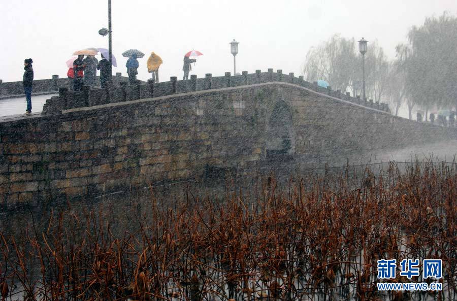 | 12月15日,游人在杭州西湖斷橋上冒雪合影。當日,受強冷空氣影響,浙江迎來今冬首場降雪。浙江省氣象臺上午9時45分發布暴雪黃色預警信號。預計未來12小時湖州、嘉興、杭州、衢州、金華、紹興、寧波東部地區將出現中到大雪,局部暴雪,積雪深度可達4-6厘米,局部10厘米以上。 |