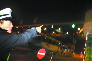 天津泗水店站,交警警告司機們不能超高運輸,否則到城裡過立交橋時會有危險。