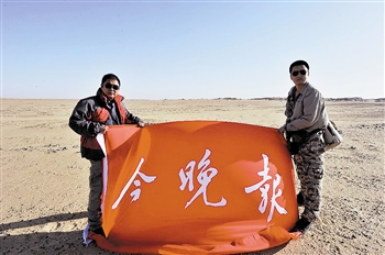 經過短暫討論後,陶寶祥隊長作出部署,派出包括本報文字記者在內的幾位年輕隊員,分別朝東南西北四個方向搜尋,並要求每五分鍾用手持無線電臺進行一次呼叫,確保外派人員不再迷失。1個多小時過去了,沙漠中的溫度已經開始降低。又過了半個多小時,本報文字記者所在的向北搜尋的隊伍,在兩座沙山的山腳下發現趴在沙地上專心拍攝的左山。見到左山時,他隨身攜帶的水早已喝完,嘴脣開始乾裂。
