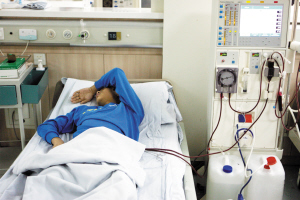 張傑躺在病床上進行血透。他的一條大腿根部的血管被割開一個口,兩根管子分別連在機器上。他告訴記者,血透就是將體內的血液抽出去,在專門的機器裡過濾毒素後,再回輸至體內。