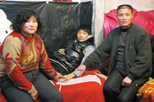 病房外,張傑的母親馬明英已經等了三個小時。從早晨三點就起床賣早點的她,實在支橕不住疲憊的身體,蓋著防寒服睡著了。張傑的父親張本纔剛剛因為甲亢住過院,挨不了飢餓,到醫院外小食攤買了4個素包子,自己吃了兩個,給妻子帶回來兩個。但妻子馬明英把包子放在一邊,說吃不下。