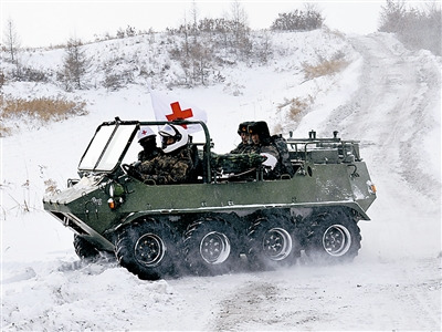 『一名戰士受重傷,馬上搶救!』指令傳出,一輛墨綠色的新型野戰急救車在直昇機掩護下急速駛來。傷員被抬上車,一旁的液晶顯示器上清晰地顯示出血型、血壓等相關數據。醫護人員向記者介紹,這種野戰急救車集成配置了呼吸機、氣動心髒按壓器、氧氣瓶、輸液泵、野戰輸血輸液加溫器、真空固定板、衛星定位儀等裝備器材,集急救、復蘇、監護、治療、運送功能於一體,一次可以同時運載8名傷員,能適應沼澤、沙漠、坡地和河流等復雜地形環境,大大提高了危重傷員搶救效率。演練中,電子傷票系統、旋壓式止血帶、急救止血敷貼、野外加熱箱組等一批適應寒區救治的專用衛生裝備大顯身手,為實現未來戰場『快搜、快搶、快救、快送』的目標提供了有力保障。