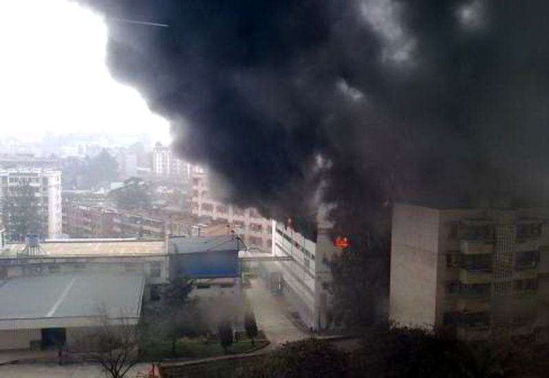 | 有目擊者稱,製藥公司4層樓竄出幾十米高的火苗、濃煙,許多人從該樓的3樓跳下逃生。 |