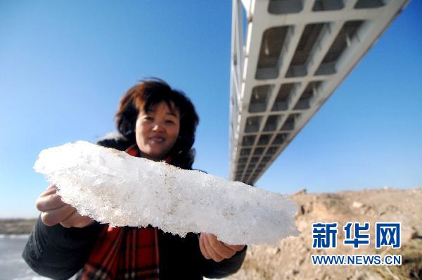 | 12月30日,水文工作人員在中太銀鐵路永寧段的黃河邊展示流凌塊。 |