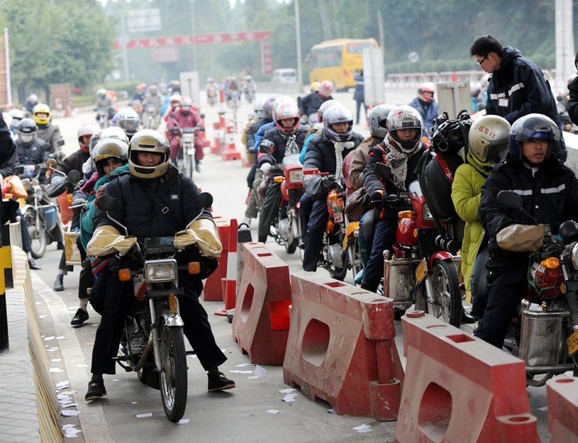 | 2011年1月27日,廣東肇慶封開縣,大批農民工騎著摩托車返鄉回廣西過年。 |