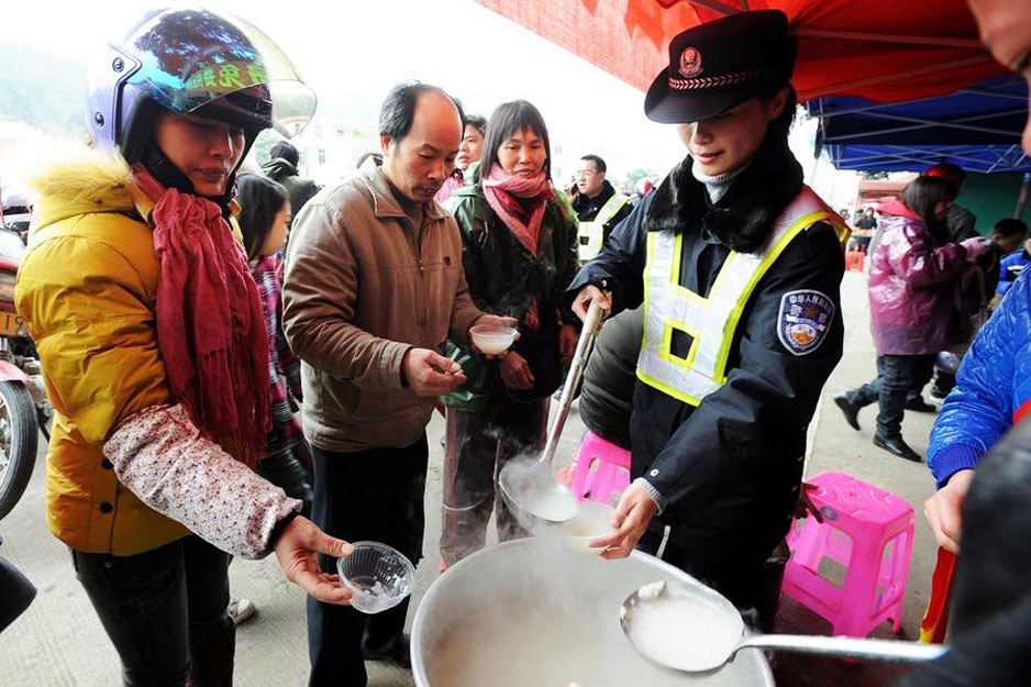 | 交警在為返鄉人員盛粥。臨時休息點裡供應熱粥,熱水,方便面,還有火爐供取暖。 |