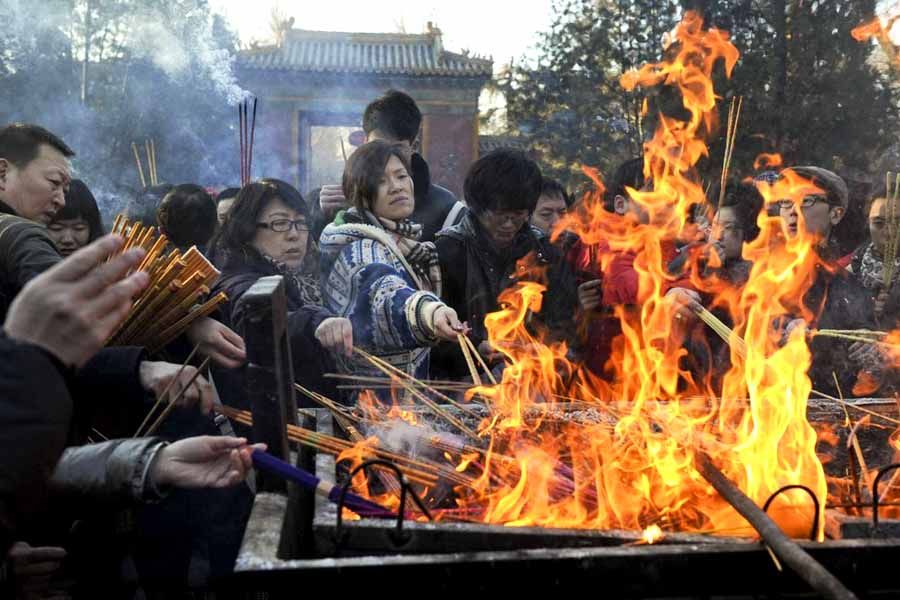 | 2月3日,大年初一,皇家寺院雍和宮內祈福敬香的市民人潮湧動。 |