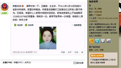 昨日,新浪微博上一條微博被500多名網友轉發。該微博稱,一名叫周萌萌的6歲半女童,於今年1月31日在四川省彭州市被拐。周萌萌的母親因思念女兒過度,現已住院。目前,家長已報案。微博裡還留下『萌爸爸』的手機號碼。
