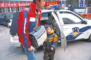 圖為貴州乞討賣唱父子被民警帶到派出所進行訊問。 記者 楊濤 攝