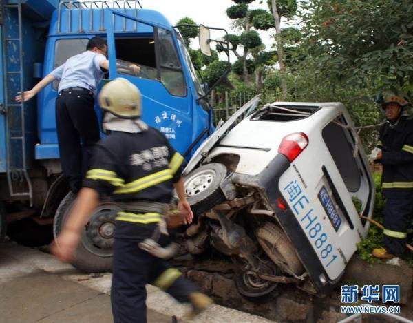 | 5月15日,救援人員在事故現場緊急施救。當日下午,國道324線福建龍海市九湖鎮路段發生一起交通事故,一輛藍色貨車與一輛白色麪包車相撞後,麪包車被擠壓在國道旁綠化帶上,造成2人死亡4人重傷。事故原因及善後工作正在處理中。 |
