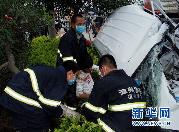| 5月15日,龍海市消防大隊將傷員從車裏救出來。當日下午,國道324線福建龍海市九湖鎮路段發生一起交通事故,一輛藍色貨車與一輛白色麪包車相撞後,麪包車被擠壓在國道旁綠化帶上,造成2人死亡4人重傷。事故原因及善後工作正在處理中。 |
