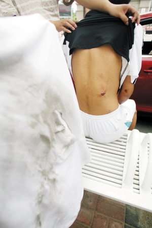 昨天中午,記者見到了受傷的高二學生小聞(化名)。小聞的後背、胳膊、腿部等多處有挫傷。而他事發時穿的校服上,也能明顯看到一個直徑15釐米左右的大洞。小聞說,到底自己被帶出多遠已經記不清了,不過,當車停下來的時候,他已經被壓在自行車下動不了了。