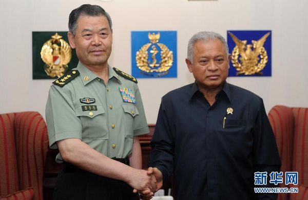 6月18日,印度尼西亞國防部長普爾諾莫·尤斯吉安託羅(右)在雅加達會見中央軍委委員、中國人民解放軍第二炮兵司令員靖志遠。新華社記者姜帆攝