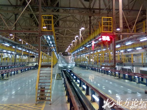 北方論壇網友“山城特勤”發帖說,凌晨時分剛剛從福州回到北京南的動臥,緩緩的從北京南站經過8公里的聯絡線進入動車運用所,進行一二級維修的工作。停在檢修上的動車組是京津城際運用車組,當夜深人靜的時候動車運用所的工作人員爲了大家的出行安全而默默奉獻着。