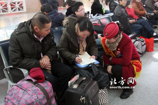 在交談中記者得知,爲了在春運路上照顧丈夫,原本在山東工作的溫秀林特地趕到了天津,兩人一起返回漢口。“我們要坐中午12:30的火車,行李多,他行動又不方便,我本來想去諮詢一下行李託運的,工作人員很熱心地告訴我,有專門的服務崗可以爲我們提供幫助。找到了服務崗,工作人員都特別熱情,馬上讓我們登記,安排我們在專門的候車室等車,還給我們倒來了熱水,再等一會兒,就可以上火車了。”溫秀林一臉欣慰地告訴記者。