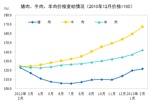 據國家統計局網站消息,2013年2月份,全國居民消費價格總水平(CPI)同比上漲3.2%。其中,城市上漲3.2%,農村上漲3.3%;食品價格上漲6.0%,非食品價格上漲1.9%;消費品價格上漲3.3%,服務價格上漲3.1%。