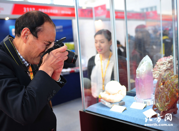 此外,大會上展出的各類礦石吸引了不少參會者拍照留念。巴西紫水晶、自然金礦石等幾十種礦產品讓人們大飽眼福。
