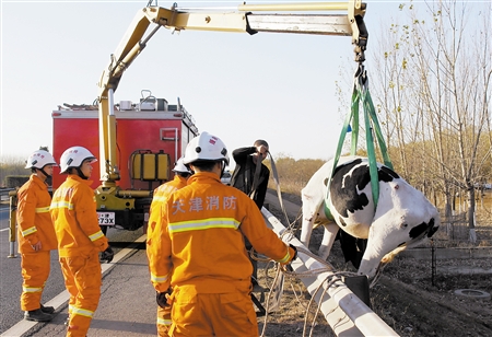 天津北方網訊:18日下午,在京津塘高速由塘沽去往市區方向,一頭奶牛在高速公路上來回亂竄。原來,13時,一輛拉載着30多頭奶牛的貨車後面圍擋被淘氣的奶牛撞開,一頭奶牛跳到了高速公路上。爲追捕奶牛並保證行車安全,京津塘高速由塘沽到市區段的入口暫時封閉。隨後經過幾十人大約兩小時的努力,終於在15時20分左右成功將奶牛逮住。