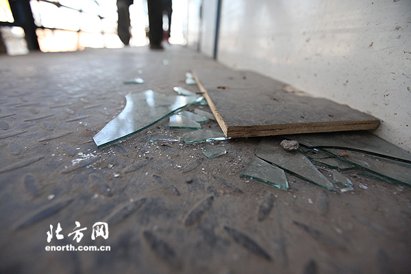 爆炸事故波及到了多處工人居住的板房,在緊挨外環線一側的一排兩層板房裏,記者一間一間看去,幾乎每一間都有不同程度的損壞,有的天花板破了個大洞,有的玻璃完全碎了,工人們只能找來廢紙箱臨時擋在窗戶上。“你看,我住的這間屋天花板裂了道大縫,這邊連頂上的石膏板都掉下來了。”“這幾間屋子玻璃都碎了,還好沒傷到人。”記者瞭解到,事發時工人們都在工地上施工,所以沒有人受傷。