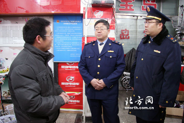 隨後,記者跟隨執法人員來到了西青區楊柳青寶華街,在街上的兩處機動三輪車銷售網點中,記者看到原先商戶銷售的機動三輪車已經不見了蹤影,改爲銷售電動自行車。銷售人員告訴記者:“原先來購買機動三輪車的大多是農戶,大概兩三千元一輛,聽說了專項治理行動後,我們現在已經停止了銷售。”