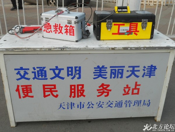 北方論壇網友“吹口哨的人”發帖說,近日,在紅橋區丁字沽附近一處十字路口,一處由交警設立的便民服務站吸引了不少市民駐足觀看。網友記者看到,一張普通的辦公桌擺放在路邊,桌子靠近路口一側“交通文明美麗天津便民服務站”幾個大字格外醒目。桌子上的急救箱、工具箱和打氣筒構成了服務站的全部內容。丁字沽大隊的執勤交警介紹說:“服務站的家當全都是交通隊自行籌集款項購買的,目的就是在市民遇到困難的時候及時有效地進行幫助。以前若遇到車主的汽車壞在路口,只能上前幫忙把車推向路邊,現在有了工具箱,就可以爲車主提供幾十種簡單的修車工具。而對於騎自行車的市民,若出現車胎沒氣、氣門芯損壞等都給備好了打氣筒和氣門芯。如果我們看到年老體弱的市民不能打氣,在不影響正常疏導交通的情況,還會幫忙打氣”。網友記者打開工具箱,見到裏面扳子、鉗子、改錐等二三十種工具一應俱全。