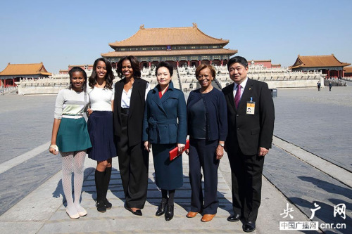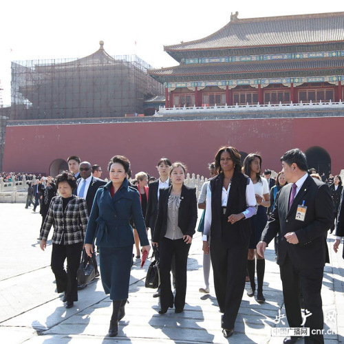 21日,彭麗媛和米歇爾一起參觀故宮。故宮博物院院長單霽翔介紹說,故宮在北京的中軸線上。在美國華盛頓,國會山到林肯紀念堂也在一條中軸線上,這說明中美在建築和城市規劃上也有相通之處。