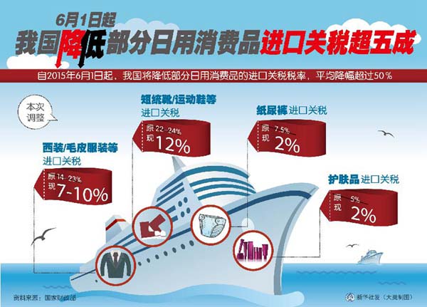 據財政部公告,自2015年6月1日起,我國部分服裝、鞋靴、護膚品、紙尿褲等日用消費品的進口關稅稅率將下調,平均降幅超過50%。