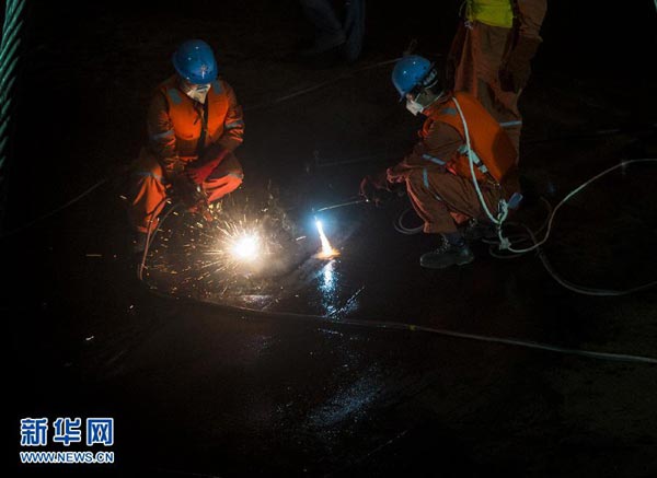 3日晚,救援人員開始對客船“東方之星”輪的底部進行切割作業。