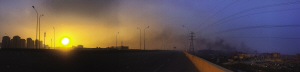 就在去往泰達醫院的路上,收到消息說現場濃煙又起。我馬上調轉車頭,將近12時又趕回到事故現場外圍,北海路和第五大街交口已經全面戒嚴,無法再深入其中的我,只好從泰達服務外包園往北走。路上就看到事故現場方向又冒出了滾滾濃煙,不同於一個多小時前看到的散狀煙,這次的煙體顏色呈黑色,而且能聞到微微的異味。從第九大街我再次往事故核心區域駛入,而這次進入天津港關卡居然沒有警戒線阻攔,我從北側和東側看到了事故現場的情況。直到我駛入離濃煙目測三百米處左右的位置,看到好像一個汽車倉庫後面冒出青煙——此時顏色又有所變淡。我抓緊拍下幾張照片,時間是12時40分許。