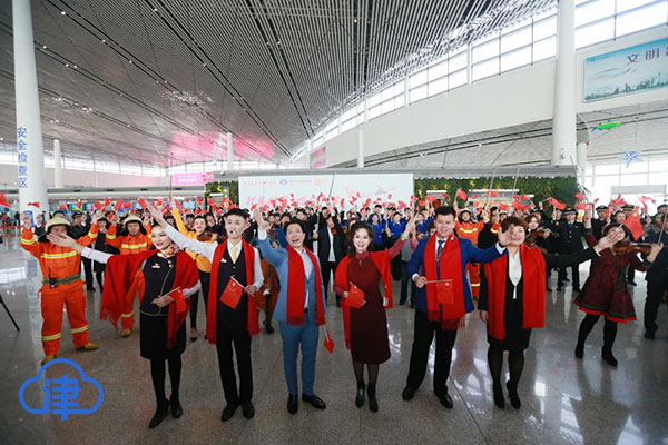 本次快閃活動由天津市文化和旅游局、天津航空有限責任公司、天津濱海國際機場聯合舉辦。“贊美家鄉·歌唱祖國”2019年元宵節文化活動暨“天天樂道·津津有味””主題彩繪飛機首航儀式也一並舉行。(津雲新聞記者吳宏 攝影馬宬)
