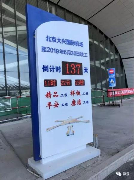 2月13日,航站樓的進港大廳門口的大屏上顯示,距2019年6月30日竣工倒計時還有137天。