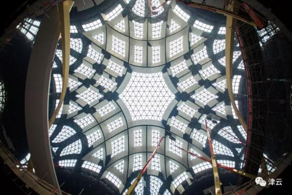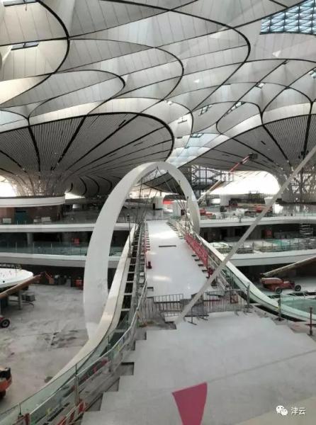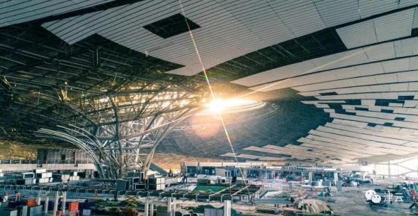 在航站樓大廳中,最引人注目的是位於核心區中央的圓形玻璃穹頂,直徑有18米,周圍還分布著巨大的C型柱。津雲記者看到,C型柱已經基本完工,從“剖面”能看到柱子內部的鋼結構。陽光從頂部天窗的格柵灑向大理石地面,形成了同樣形狀的光影,猶如湖面倒影。由於通透的C型柱和氣泡狀天窗的設計,使得航站樓在白天不用完全依賴人工照明。