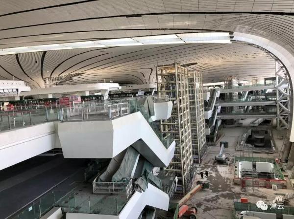 隨後,津雲記者通過鋪著裝修板的樓梯上到五層,整個航站樓內的建設景象盡收眼底。從三層到五層,都有工人在施工,樓內有吊車在輔助施工,整座航站樓還在緊張建設中……