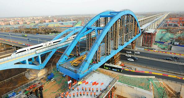 京雄城際鐵路黃固村特大橋跨京開高速公路一體式雙線簡支鋼箱拱橋頂推順利完成