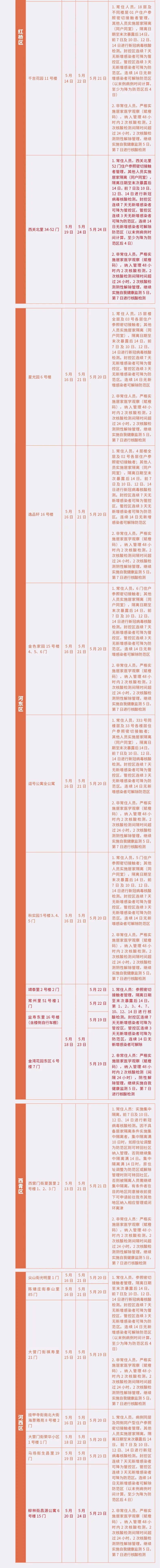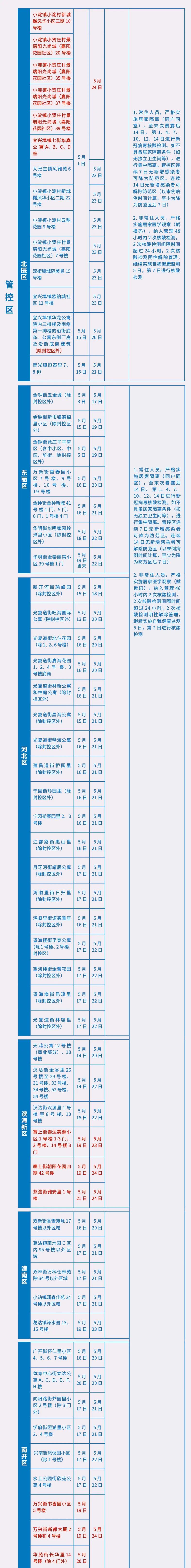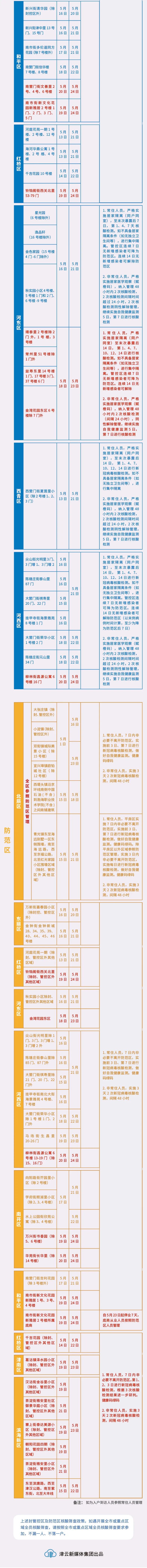 管控區新增具有5月19日(含)以來途經濱海新區寨上街泰達美源小區1號樓1-3門、2號樓、14號樓3門,具有5月19日(含)以來途經濱海新區寨上街朝陽花園四期42號樓,具有5月21日(含)以來途經濱海新區茶淀街雅安裡1號樓,具有5月19日(含)以來途經南開區萬興街書香園小區5號樓,具有5月19日(含)以來途經南開區萬興街新都大廈2號樓和4號樓,具有5月20日(含)以來途經南開區華苑街長華裡14號樓(除4門外),具有5月20日(含)以來途經和平區南營門街文善裡2號、4號、6號樓,具有5月19日(含)以來途經和平區南市街新文化花園新雅居2號樓1門、2門、3門、5門,具有5月19日(含)以來途經紅橋區鈴鐺閣街西關北裡53-79門旅居史的常住人員,嚴格實施居家隔離(同戶同室)。非常住人員,嚴格實施居家醫學觀察(賦橙碼)。