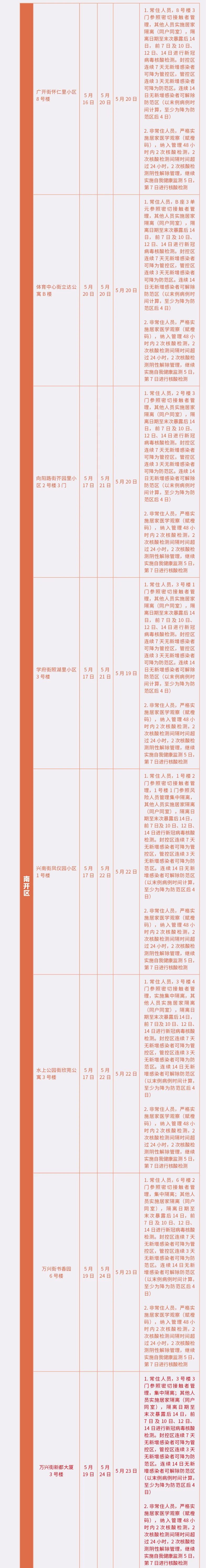 管控區新增具有5月18日(含)以來途經河東區靖泰裡2號樓除2門外、1號樓、3號樓,河東區常州裡51號樓除1門外,河東區益壽東裡14號樓1門、17號樓3門、37號樓6門,河東區金灣花園東區6號樓除7門外旅居史的常住人員,嚴格實施居家隔離(同戶同室)。非常住人員,嚴格實施居家醫學觀察(賦橙碼)。