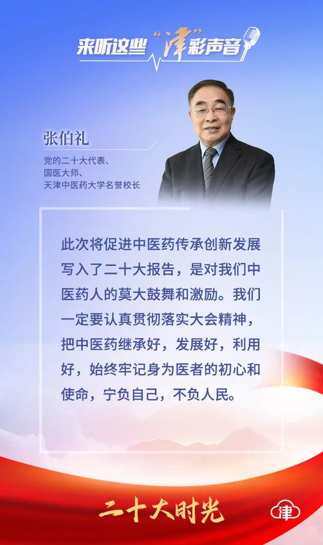 黨的二十大代表、國醫大師、天津中醫藥大學名譽校長張伯禮院士說:“現場聆聽了習近平總書記的報告,感到非常激動,心潮澎湃。習近平總書記在報告中指出,‘推進健康中國建設,把保障人民健康放在優先發展的戰略位置’‘促進中醫藥傳承創新發展,健全公共衛生體系,加強重大疫情防控救治體系和應急能力建設,有效遏制重大傳染性疾病傳播。’在過去的十年中,我親身感受到了黨和政府對中醫藥的大力支持,中醫藥服務能力不斷提昇,大健康產業長足發展,中醫藥特色優勢進一步彰顯,在加快推進健康中國建設和維護群眾健康中發揮了重要作用。此次又將促進中醫藥傳承創新發展寫入了二十大報告,是對我們中醫藥人的莫大鼓舞和激勵。我們一定要認真貫徹落實大會精神,把中醫藥繼承好,發展好,利用好,始終牢記身為醫者的初心和使命,寧負自己,不負人民。”