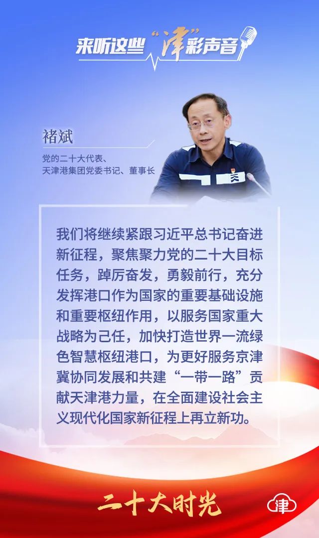 黨的二十大代表、天津港集團黨委書記、董事長褚斌說:“習近平總書記在報告中指出,‘必須完整、准確、全面貫徹新發展理念,堅持社會主義市場經濟改革方向,堅持高水平對外開放,加快構建以國內大循環為主體、國內國際雙循環相互促進的新發展格局’,為我們指明了前進的方向、明確了奮斗的目標。近年來,我們忠誠踐行習近平總書記視察天津港重要指示精神,全球首個‘智慧零碳’碼頭僅用21個月建成投產,2021年天津港集裝箱吞吐量突破2000萬標准箱,助力天津北方國際航運樞紐建設取得重大突破。今後,我們將繼續緊跟習近平總書記奮進新征程,聚焦聚力黨的二十大目標任務,踔厲奮發,勇毅前行,充分發揮港口作為國家的重要基礎設施和重要樞紐作用,以服務國家重大戰略為己任,加快打造世界一流綠色智慧樞紐港口,為更好服務京津冀協同發展和共建‘一帶一路’貢獻天津港力量,在全面建設社會主義現代化國家新征程上再立新功。”