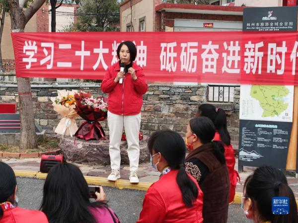 10月27日,在河南省林州市黃華鎮廟荒村村口,黨的二十大代表、廟荒村黨支部書記郁林英和鄉親們分享參加黨的二十大的感受和收獲。新華社發