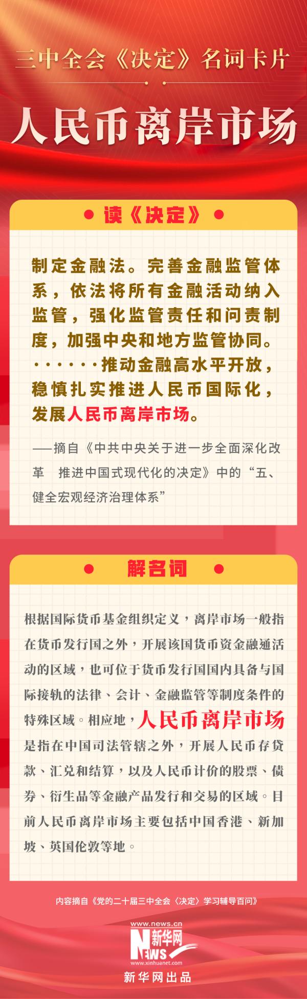 黨的二十屆三中全會審議通過了《中共中央關於進一步全面深化改革、推進中國式現代化的決定》。新華網依據《黨的二十屆三中全會〈決定〉學習輔導百問》,制作三中全會《決定》系列名詞卡片,和大家一起來深入學習領會二十屆三中全會精神。本期名詞是“人民幣離岸市場”。