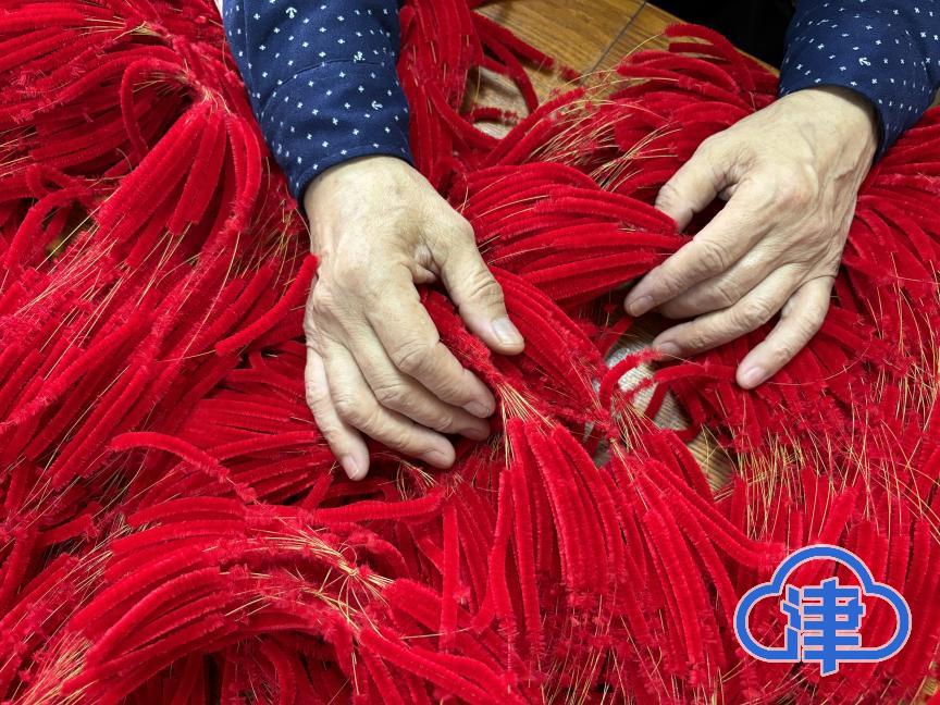 其實,這只紅絨花的背後,有著“天津掰掰”尚永森的功勞,因為他和父親合力染制出的“天津大正紅色”真絲繡絨,正是絕大多數天津手藝人制作紅絨花的原材料。從20多歲接手真絲繡絨制作,到後來的制作紅絨花、受邀開設絨花課堂,65歲的尚永森說,他的所有努力,都是想讓這朵絨花更長久地開下去。