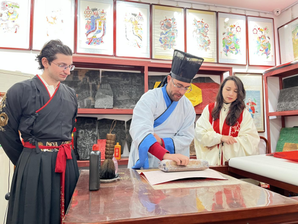 隨後,外國友人來到了玉成號年畫坊。楊柳青木版年畫作為中國民間藝術的瑰寶,以其獨特的制作工藝和豐富的題材內容聞名遐邇。在這裡,三位外國友人被色彩斑斕、栩栩如生的年畫所吸引。在年畫師傅的指導下,他們親自體驗了木版年畫的制作過程,從選紙、墨線勾勒到色彩套印,每一步都讓他們感受到了傳統技藝的魅力和匠心獨運。這次體驗讓他們更加直觀地感受到了中國文化的獨特魅力和中國人民的智慧與創造力,也對中國的傳統文化有了更深的理解。