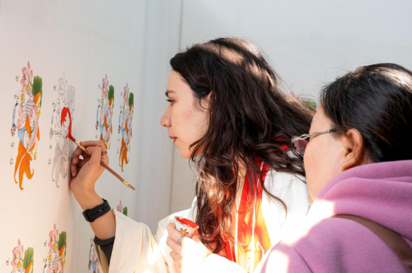 委內瑞拉青年蘇小安(左一)在年畫師傅指導下為年畫著色