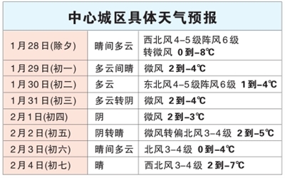 假日期間,本市以晴到多雲天氣為主,除夕至初一氣溫明顯偏低,中心城區最高氣溫僅為0-2℃,最低氣溫-8℃,北部地區-14℃左右;初二至初七氣溫持續偏低。受冷空氣影響,除夕、初二和初五再次起風,除夕白天和初二陸地將有西北風4-5級陣風6級,初五至初六有偏北風3-4級。除夕夜間至初一白天,部分時段有中到重度霾。(津雲新聞編輯王舒瑤)