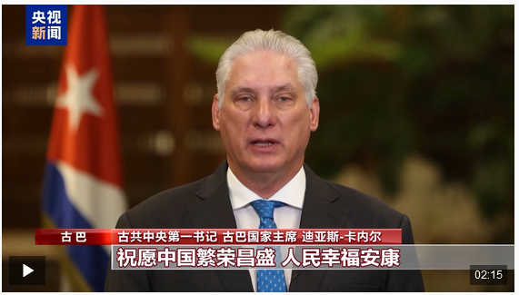 古共中央第一書記 古巴國家主席 迪亞斯-卡內爾:親愛的中國人民和中國領導人,古巴願與中國共慶新春佳節,我謹代表古巴共產黨、政府和人民,向你們致以最誠摯的祝福。祝願中國繁榮昌盛,人民幸福安康。在新的一年到來之際,我們致力於以堅定和可靠的步伐前進,繼續捍衛社會主義事業,繼續推動共建中古命運共同體,祝賀各位!
