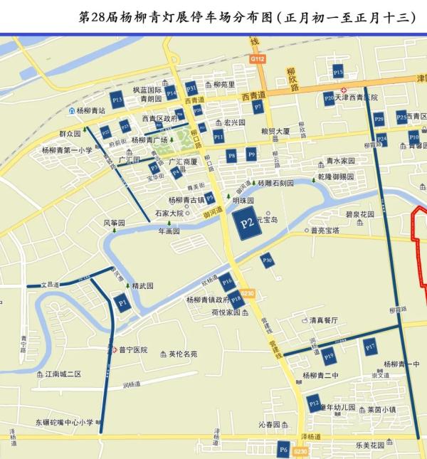 ①市區→津靜公路→柳霞路→(左轉)澤楊道→(右轉)青靜路→第28屆楊柳青燈展第一停車場