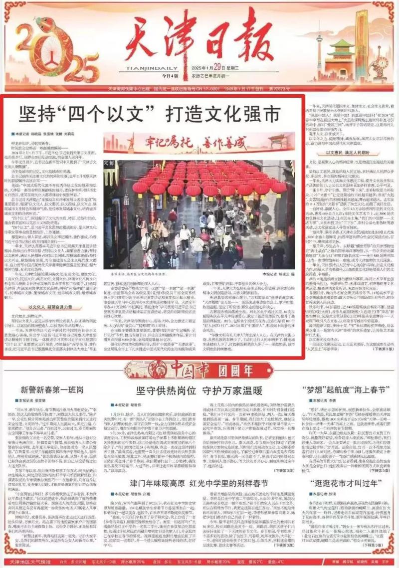 一年來,天津認真落實習近平總書記視察天津重要講話精神,陸續出臺多項舉措,堅持以文化人,凝聚奮進力量;堅持以文惠民,滿足人民期盼;堅持以文潤城,厚植城市底蘊;堅持以文興業,賦能城市發展,為全面建設社會主義現代化大都市、奮力譜寫中國式現代化天津篇章提供堅強思想保證、強大精神力量、有利文化條件。