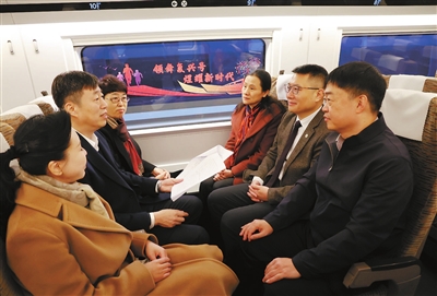 住津全國政協委員在赴京列車上討論提案。 記者 王倩 攝