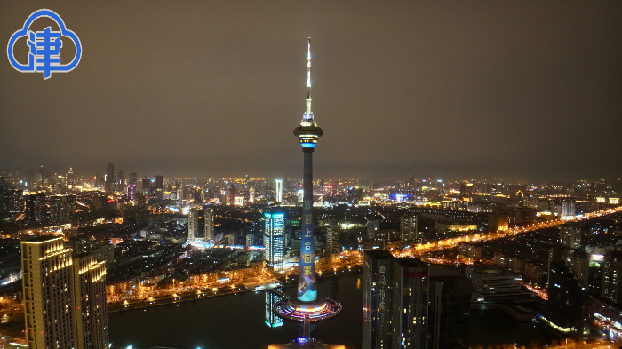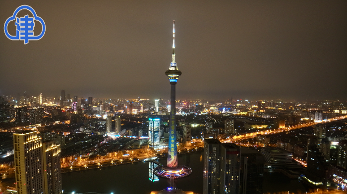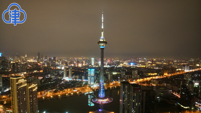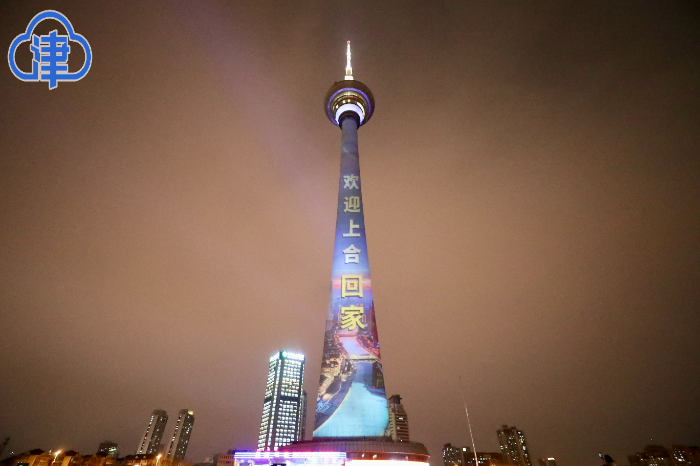 3月7日晚19點半,天津天塔亮起主題燈光秀,迎接慶祝上合組織峰會在天津主辦。