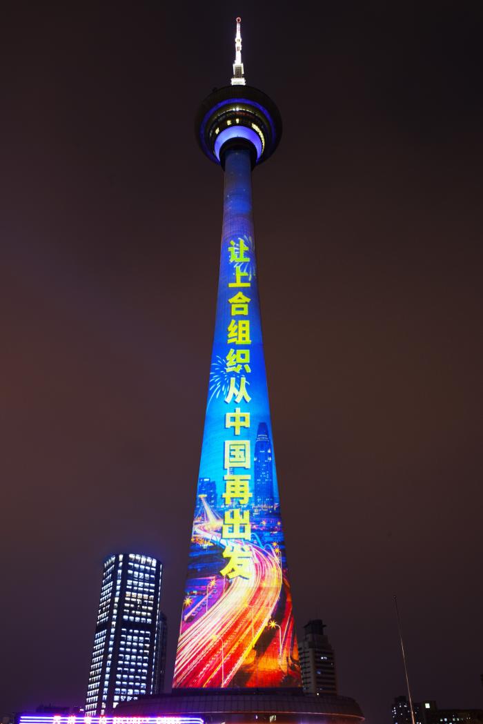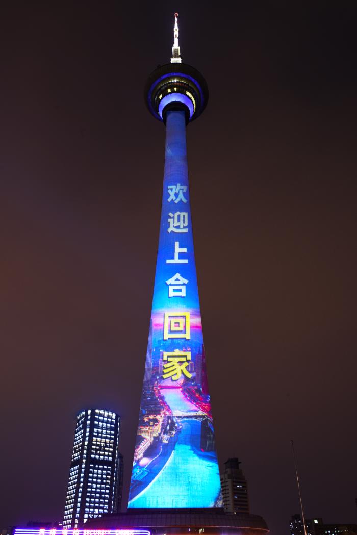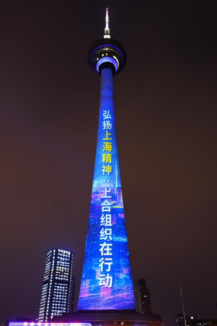 “歡迎上合回家”“讓上合組織從中國再出發”“弘揚‘上海精神’:上合組織在行動”3張主題燈光秀圖片映照塔體上,熠熠生輝,閃耀全市。